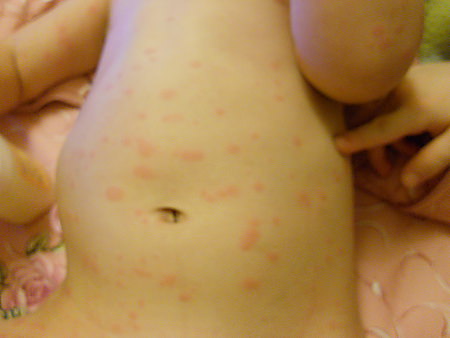 幫他洗完澡後發現這些紅不隆咚的小點點還冒到肚子上來