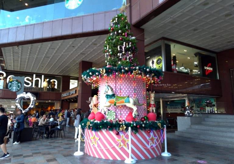 不過這個木馬不能騎,倒是可以拍拍照,整個聖誕樹造型就像三層蛋糕結合了旋轉木馬,除了糖果和聖誕樹外,還多了鮮奶油和草莓及櫻桃,也算是走萌粉路線呢!有經過記得拍拍照囉。
