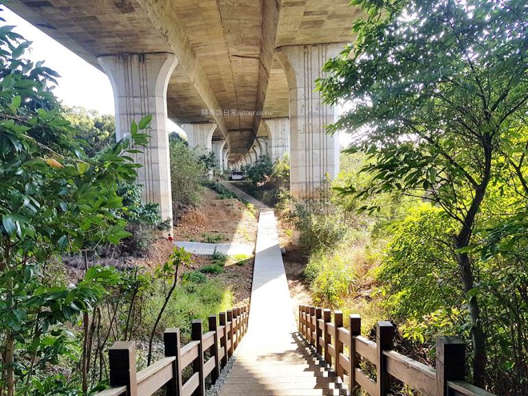 整個步道就在二高高架橋下,有坡度也都是微微的高度,整體來說都是平坦好走的。其中幾個部分路段還很寬廣,也看到很多車子都是直接停車,再開始往上走。